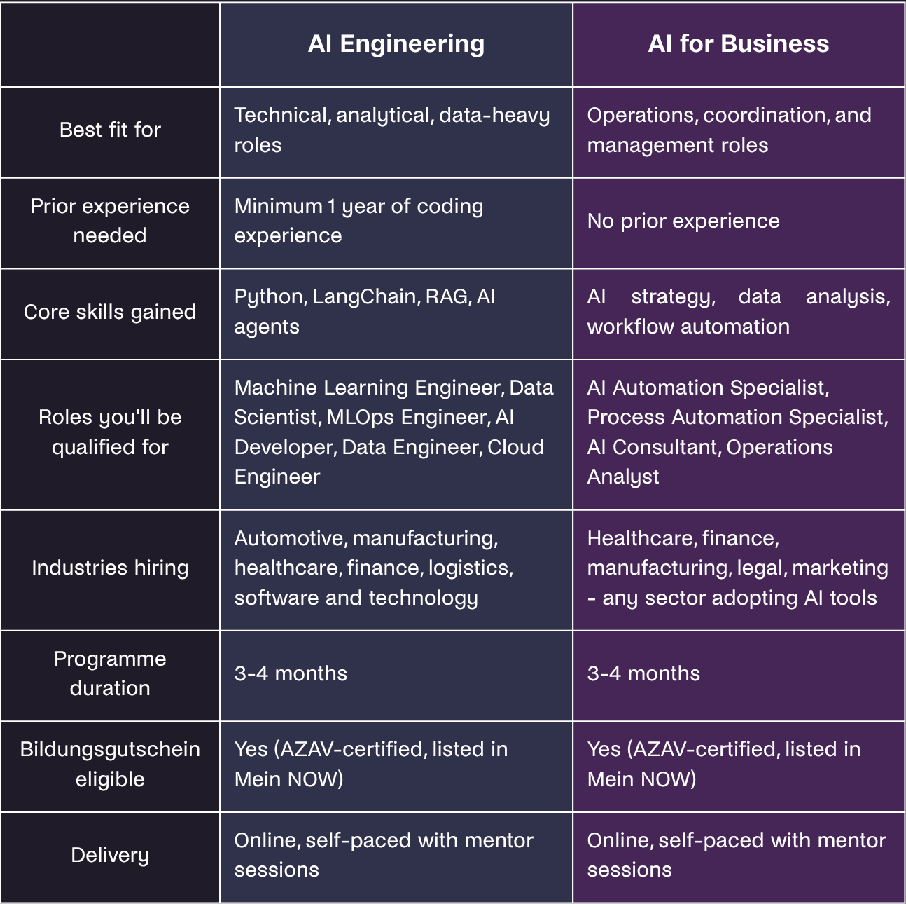 - Both programmes are available fully online: Turing College's AI Engineering and AI for Business are AZAV-certified, listed in Mein NOW, and completable in 3 months at around 8–12 hours per week