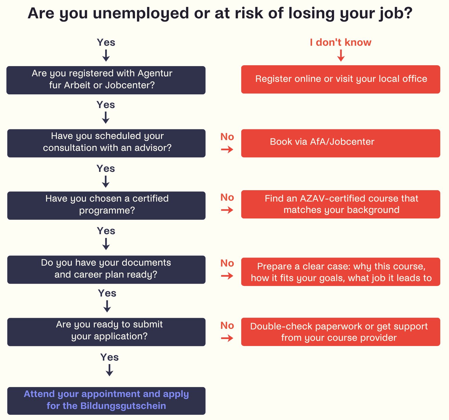 The fastest way to know whether you qualify for a Bildungsgutschein is our free eligibility quiz. Answer a few questions about your situation, and you'll have a clear answer in under two minutes.